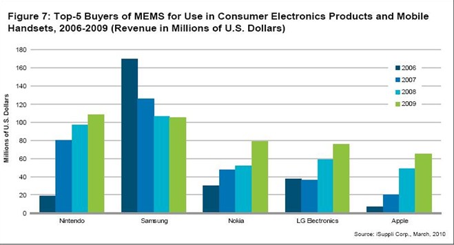 據iSuppli公司,日本任天堂在2009年超越韓國的三星,成為用于消費電子產品和手機的微機電系統(MEMS)的全球最大買家。