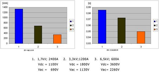 結果顯示,采用3.3kV、1200A獨立模塊得到的最大功率約為采用1.7kV、2400AIGBT所得功率的一半。相比之下,6.5kV、600AIGBT模塊所提供的功率僅為1.7kVIGBT的四分之一。產生這一結果的原因是IGBT模塊的損耗。如果計算圖2中三個變換器的效率,可以看到損耗比為1:2:4。
