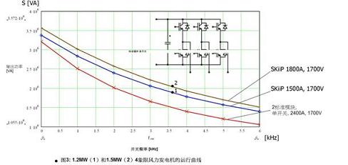 兩個單管模塊將提供一個2.4kA的半橋。比較計算的結果可以看到,與放置在最大外殼中的標準模塊相比,采用SKiiP的方案可在整個開關頻率范圍內提供更高的輸出電流。可用逆變器輸出功率與開關頻率的關系見圖3。