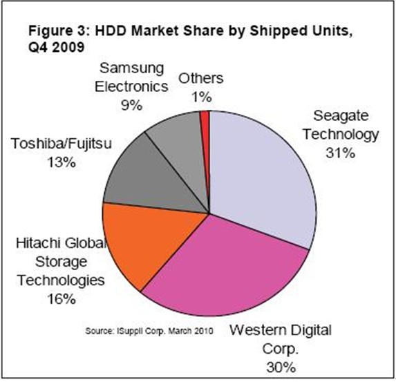 2009年第四季度希捷的硬盤出貨量約為4990萬個,比第三季度的4630萬增長8%,按出貨量計算的市場占有率高達31%。營業收入從第三季度的26.6億美元增長到30.3億美元,增幅為14%,市場份額為34%。