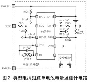 阻抗跟蹤鋰離子單節(jié)電池組電路如圖2所示。通過(guò)BAT2引腳輸入端測(cè)量電池電壓,通過(guò)庫(kù)侖計(jì)數(shù)器差動(dòng)信號(hào)輸入端(SRP及SRN)監(jiān)測(cè)電流。系統(tǒng)利用電量監(jiān)測(cè)計(jì)從單線SDQ通信端口獲得SOC及運(yùn)行時(shí)間接近結(jié)束(Run-Time-to-Empty)等信息。