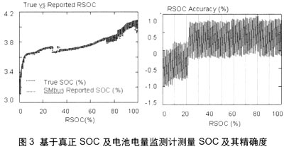 即使在負(fù)載變化的情況下,IT電量監(jiān)測(cè)計(jì)也能正確預(yù)測(cè)電池的剩余電量。例如,數(shù)碼相機(jī)處于不同工作模式時(shí),電池的負(fù)載也不同。圖3顯示了IT電量監(jiān)測(cè)計(jì)如何精確預(yù)測(cè)電池剩余電量。剩余電量預(yù)測(cè)的誤差率可小于1%。并且,由于用以預(yù)測(cè)剩余電量的電池阻抗及老化作用能夠得到實(shí)時(shí)更新,故在電池整個(gè)使用壽命內(nèi)均可保持這種微小誤差。