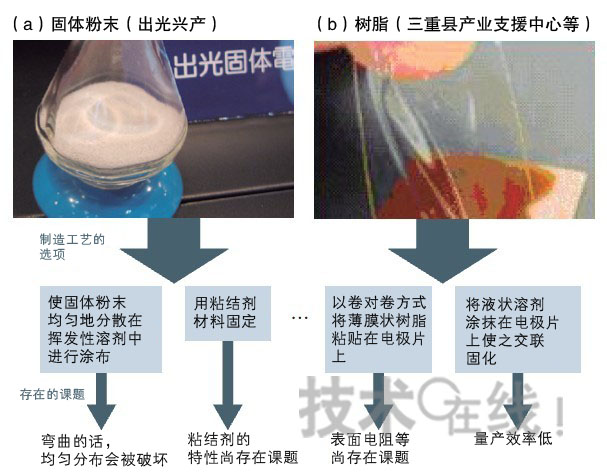 出光興產(chǎn)正在研究借助硫化物類粉末來形成均一電解質(zhì)層的方法(a)。三重縣產(chǎn)業(yè)支援中心等為了降低電解質(zhì)與電極片之間的表面電阻,目前正在研究在電極片上涂抹樹脂溶液后,通過交聯(lián)形成高分子的方法(b)。 三重縣產(chǎn)業(yè)支援中心使用樹脂作為電解質(zhì)。由于是“非凝膠狀的無漏液干樹脂”(該中心高級部件技術革新中心業(yè)務總負責人伊坪明),因此適于以卷對卷方式進行量產(chǎn)。不過,在實用化方面還存在需要攻克的課題。該中心“將努力通過降低表面電阻使輸出電壓提高至目前的兩倍”(伊坪明),目前正在研究向電極片涂抹溶液狀樹脂使之交聯(lián)固化的方法。