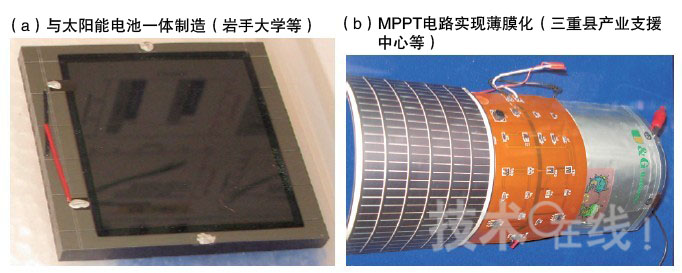 (b)為三重縣產(chǎn)業(yè)支援中心等的開發(fā)示例,與太陽能面板、最大功率點跟蹤(MPPT)電路,以及鋰聚合物充電電池進行了組合。
