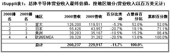 表1所示為iSuppli公司對(duì)2009年各地區(qū)半導(dǎo)體營(yíng)業(yè)收入的最終估計(jì)。