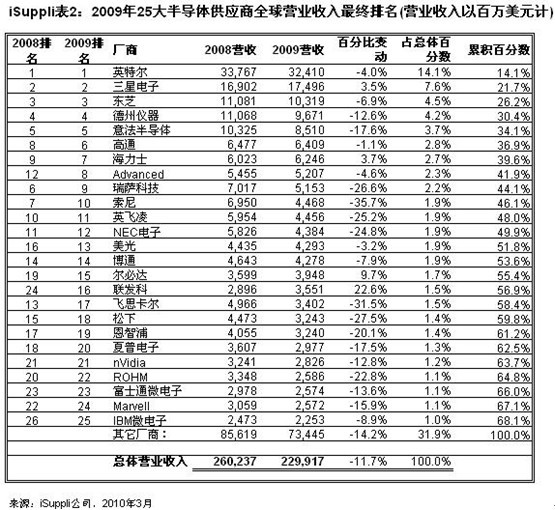 表2所示為iSuppli公司對(duì)2009年全球半導(dǎo)體廠商營(yíng)業(yè)收入的最終排名。