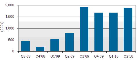 圖一:從Q3’08到Q2’10應用于電子書電子紙出貨量 (單位 :千片)