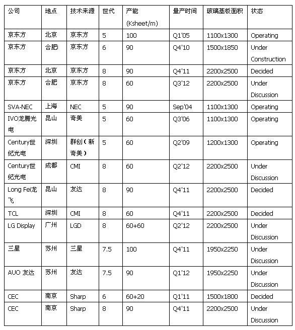 2004-2011年中國主要大尺寸TFT-LCD面板生產線一覽