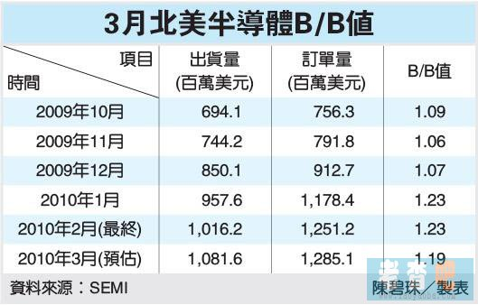 國際半導(dǎo)體設(shè)備材料產(chǎn)業(yè)協(xié)會(SEMI)公布,3月最新北美半導(dǎo)體訂單出貨比(Book-to-Bill)為1.19,較2月修正后的1.23略為下降,仍是連續(xù)第九個月超過1以上的紀(jì)錄,加上絕對訂單,與出貨金額各創(chuàng)30個月與20個月新高,顯示半導(dǎo)體景氣仍在多頭。