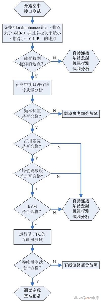 基于方便合理的原則,應首先使用空中接口測量方式在合適的地點檢查基站發射機的信號覆蓋和信號質量,爭取在空口測試中對基站狀態做出準確判斷。如難以判斷空口測量結果或需要精確測量發射功率,則需要直接連接基站進行測試。測試步驟如圖2所示。