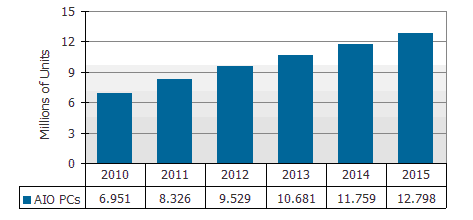 圖二:2010-2015年AIO PCs出貨量預(yù)測(單位:百萬臺)