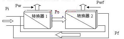 第二種工作模式是引入能量反饋的情況下,能量轉換如圖3所示:轉換器1為需要例行使用的電源轉換器,轉換器2為用于能量反饋的轉換器,Pi為系統外給轉換器1的輸入能量,Pw為轉換器1轉換過程中的消耗能量,Po為例行使用電源轉換器1正常應輸出的能量,同時也是轉換器2的輸入能量;Pwf為用于能量反饋的轉換器2轉換過程中的消耗能量,Pf為轉換器2反饋給電源轉換器1的能量。
