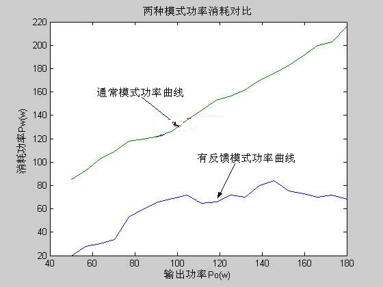 結果分析:在通常工作模式情況下,曲線的波動是由于電能轉換器的轉換效率影響造成的,由前面原理分析可知消耗功率為Pi=Po+Pw,如果轉換效率為,則Pi=Po/η,轉換效率η通常隨著輸出功率的變化有一定的波動,所以曲線的波動符合理論分析;在有反饋的工作模式情況下,由前面原理分析部分得系統的消耗功率為Pi=Pw+Pwf,分別設轉換器1的轉換效率為η1,反饋部分的轉換效率為η2,則系統的消耗功率為: