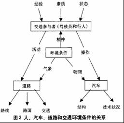 汽車道路交通事故是世界性的災(zāi)害,因此汽車交通安全也是世界性的難題。道路交通事故引起人的傷亡,財產(chǎn)的損失,給國民經(jīng)濟也帶來了巨大的損失。然而誘發(fā)交通事故的因素是多方面的,它受汽車行車速度、道路條件、車輛狀況、駕駛員行為、駕駛員的文化素質(zhì)和自然環(huán)境等因素的綜合影響。其中人、汽車、道路、環(huán)境條件是影響道路交通安全的主要因素,它們之間的關(guān)系見圖2。