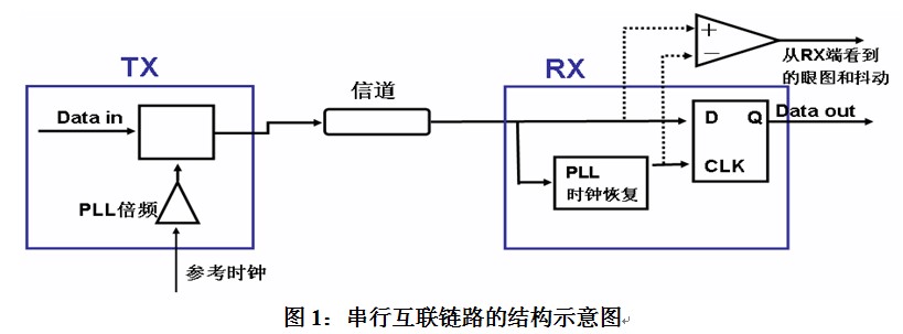 從整個(gè)鏈路的組成來看,發(fā)送器參考時(shí)鐘的抖動(dòng)在串并轉(zhuǎn)換時(shí)就引入到整個(gè)鏈路中,影響著TX端發(fā)送出的數(shù)據(jù)的抖動(dòng),而接收器要從這些數(shù)據(jù)中恢復(fù)出時(shí)鐘來進(jìn)行后續(xù)的處理。可以看出發(fā)送器參考時(shí)鐘的性能對(duì)整個(gè)鏈路的性能起到很關(guān)鍵的作用。本文從時(shí)鐘抖動(dòng)的相關(guān)概念、測試實(shí)例、測試注意事項(xiàng)、測試難點(diǎn)幾方面對(duì)時(shí)鐘抖動(dòng)測試進(jìn)行分析和探討。