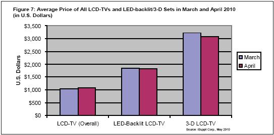 圖7所示為2010年3月和4月整體液晶電視與LED及3D電視平均價(jià)格的對(duì)比。