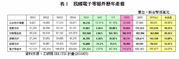 - 預估2010年第二季我國電子零組件產值將達新臺幣2,197億元