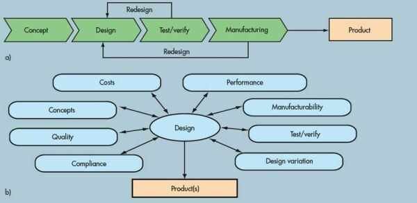 圖:(a)傳統(tǒng)PCB串行開發(fā)流程的設(shè)計(jì)周期長,信息共享有限,而成本持續(xù)上升;(b)并行開發(fā)流程允許多個(gè)開發(fā)程同步進(jìn)行,有助于確保設(shè)計(jì)成功,避免延誤、額外開銷以及返工。