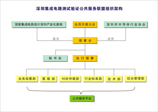 如上圖所示,會員代表大會由IC設(shè)計公司,封裝測試廠,設(shè)備廠商,高校,研究所和電子制造工廠代表組成,是深圳集成電路測試驗證公共服務(wù)聯(lián)盟的最高權(quán)力機構(gòu),下設(shè)理事會,理事會是聯(lián)盟管理的智囊團,各種規(guī)章制度的起草者和重大事務(wù)的決策者,其下又設(shè)執(zhí)行理事和秘書處,執(zhí)行理事負責(zé)日常事務(wù)的實際運行,是公共服務(wù)聯(lián)盟的操作單位,秘書處主要負責(zé)會員代表大會的召開以及日常會員事宜的組織,執(zhí)行理事又下設(shè)業(yè)務(wù)拓展部、客服部、糾紛仲裁部、行業(yè)標(biāo)準(zhǔn)部、技術(shù)部和綜合管理部。