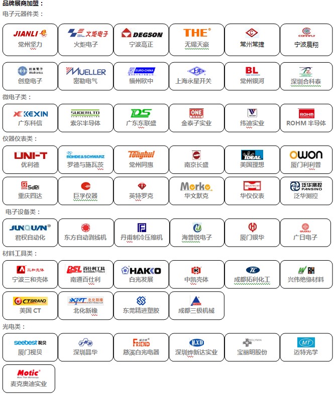 展示范圍:電子元器件、電子材料;制造設(shè)備、測試/測量設(shè)備;汽車電子、航空航天/軍用電子、交通電子、工業(yè)自動化控制;消費電子、電腦/網(wǎng)絡(luò)系統(tǒng)及外圍設(shè)備、通信產(chǎn)品/廣電設(shè)備;電力電子、安防電子