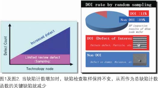 半導體制造中廣泛采用晶圓自動檢測系統已逾30年。在線晶圓檢測有助于推進制造技術的發展,它能早期檢測到工藝中的缺陷,從而減少開發時間并防止產出超時。過去,檢測缺陷的能力是主要關注點之一,但現在的要求改變了。近幾年來,每一晶圓的缺陷計數迅速增長至每一晶圓多達100萬個缺陷,這是因為晶圓尺寸變大,同時檢測技術靈敏度更高了(圖1)。雖然總檢測計數增加及關鍵缺陷尺寸變得更小,這一時期缺陷檢查的典型策略并未改變,尤其是在隨機取樣占主導的缺陷檢查區域。這種情況能產生常與干擾缺陷在一起的缺陷pareto圖(圖2)。