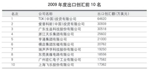 本屆元件百?gòu)?qiáng)企業(yè)中,97家企業(yè)有出口業(yè)務(wù),其中53家企業(yè)的出口下滑,有15家企業(yè)的出口下降程度在30%以上。出口總額超過(guò)1000萬(wàn)美元的企業(yè)達(dá)到68家,比上屆少1家;出口總額超過(guò)5000萬(wàn)美元的企業(yè)有25家,也比上屆少1家。但是,有16家企業(yè)2009年的出口額超過(guò)了1億美元,比上屆多1家。