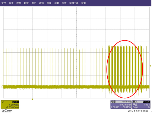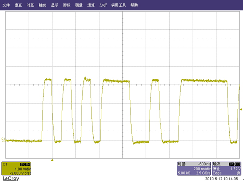 由于這些通信數據量的加大是突發出現的,用手動抓到的突發數據量波形很難剛好在時基觸發點附近,這樣波形放大后我們需要觀察的區域可能會無法滾進屏幕里,即使能滾進屏幕里,放大后的波形也可能由于時基、采樣等原因而失真的比較嚴重。而在一般情況下,我們都是考慮把觸發電平設置在如下圖“正統”的波形范圍里,但這樣也就抓不到“飛鳥”了: