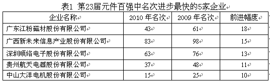 金融危機造成的企業(yè)經(jīng)營上的波動都反饋到了第22屆、23屆元件百強的榜單上。在近兩屆的榜單之中,均有20多家企業(yè)的名次出現(xiàn)了10位以上(含10位)的較大波動,去年23家,今年21家。據(jù)估計,如果國際國內(nèi)的經(jīng)濟形勢能保持穩(wěn)定,在未來一兩年內(nèi),元件百強榜單中,名次出現(xiàn)大起大落的企業(yè)數(shù)量將會減少。