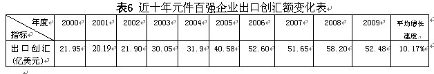 從第14屆元件百強到第23屆元件百強的十年間,元件百強出口創(chuàng)匯額增長了2.4倍,年平均增長率達到10.17%(見表6,圖二)。