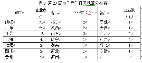 新一屆元件百強的地區(qū)分布格局并沒有出現(xiàn)大的變化,100家企業(yè)分布在我國20個省、市、自治區(qū)。浙江、廣東、江蘇三省仍然是元件百強企業(yè)最為集中的地方,企業(yè)數(shù)分別為31家、29家和12家。長三角地區(qū)的江、浙、滬三省市以47席幾乎占據(jù)元件百強企業(yè)的半壁江山。