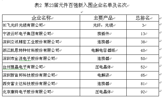本屆元件百強中共有9家新企業(yè),其中,我國光纖光纜制造業(yè)的龍頭企業(yè)長飛光纖光纜有限公司表現(xiàn)最為突出,一舉斬獲本屆元件百強的季軍寶座。而寧波云環(huán)電子集團有限公司、深圳立訊精密工業(yè)股份有限公司、浙江凱恩特種材料股份有限公司、深圳市金洋電子股份有限公司等新入圍企業(yè)均表現(xiàn)不俗。
