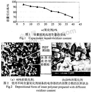 筆者重點討論了在用二步法制備聚合物電解質的過程中氧化劑含量、聚合溫度等工藝條件對聚合物鉭電容器電容量C、介質損耗和Res等電參數的影響。
