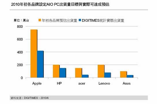 計算機一體機(AIO PC)(All In One PC,AIO PC)在2009年創下685萬臺、成長45.7%銷售成績后,DIGITIMES Research資深分析師兼主任簡佩萍預估,2010年 AIO PC 出貨量將進一步提高至1,115萬臺,成長62.8%,展現新興產品的強勁成長力道。