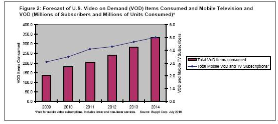 2010年美國(guó)移動(dòng)視頻點(diǎn)播(VOD)和移動(dòng)電視活躍用戶(hù)預(yù)計(jì)增長(zhǎng)到350萬(wàn)個(gè),2009年是310萬(wàn)個(gè)。隨后幾年用戶(hù)數(shù)量預(yù)計(jì)繼續(xù)增長(zhǎng),到2014年達(dá)到500萬(wàn)個(gè)。