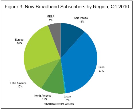 圖3所示為iSuppli公司對2010年第一季度寬帶用戶增長情況的預(yù)估,按地區(qū)細(xì)分。
