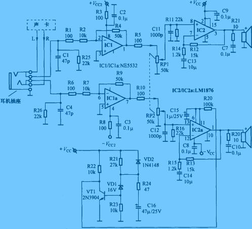 IC1及周圍元件組成緩沖放大級,電路增益=R4/(R1+R2)=50/(10+0.1)≈5倍。為了避免在電腦關(guān)機后,在聲卡停止工作時,前置放大器輸入端懸空,處于高阻抗輸入狀態(tài),將感應到的50Hz交流電信號送到后級電路放大,從而在揚聲器中出現(xiàn)較強的噪聲,特設(shè)置了22kΩ電阻R25、R26,這樣不但可以將輸入阻抗限制在22kΩ,避免前置電路工作在高阻抗狀態(tài),還可以對50Hz感應信號進行有效的抑制,提高整機信噪比。