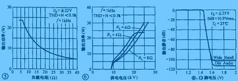 LM1876的負載范圍很寬,在4~30Ω的范圍內(nèi)均能穩(wěn)定地工作,其輸出功率與負載的對應關(guān)系如圖5所示。LM1876的供電電壓范圍為±10~±25V,當供電電壓降低時,影響的只是輸出功率的大小,而對其他指標影響不大,供電電壓與輸出功率的對應關(guān)系如圖6所示。LM1876的6、11腳為左/右聲道靜噪控制端,當這幾腳接高電平(高于1.6V)時,LM1876內(nèi)部電路執(zhí)行靜音操作,切斷輸出端的音頻信號(如圖7所示)。因此可以在這些引腳中與正電壓之間接一個RC延時網(wǎng)絡,使其在開機瞬間為高電平,輸出電路無音頻信號輸出,延時一段時間后,再正常輸出,以達到避免開機瞬間輸出端電位失諧對揚聲器的沖擊。在圖4中,晶體管VT1、R24、C16、R20、C15即為開機延時網(wǎng)絡,調(diào)整它們的取值范圍,可以改變延時時間的長短,從而獲得滿意的開機延時時間。