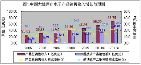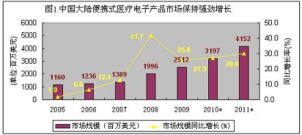 2005-2009年,中國(guó)大陸便攜式醫(yī)療電子產(chǎn)品市場(chǎng)呈現(xiàn)出加速增長(zhǎng)勢(shì)態(tài),年復(fù)合增長(zhǎng)率高達(dá)30.8%,幾乎沒(méi)有受到金融危機(jī)的影響。2009年市場(chǎng)總規(guī)模達(dá)到25.12億美元,增長(zhǎng)速度達(dá)到25.8%占醫(yī)療電子產(chǎn)品總市場(chǎng)的53.2%。在便攜式醫(yī)療電子市場(chǎng)中,家用的占六成以上的份額,電子血壓計(jì)、便攜式血糖儀和電子助聽(tīng)器占據(jù)了90%以上的銷售份額。由于目前市場(chǎng)處于普及的初級(jí)階段,中國(guó)人口基數(shù)大,國(guó)人健康意識(shí)的提升,整個(gè)便攜式醫(yī)療電子市場(chǎng)需要面對(duì)的是中國(guó)內(nèi)需市場(chǎng),不存在市場(chǎng)飽和所謂的受金融危機(jī)影響。所以家用便攜式醫(yī)療電子產(chǎn)品市場(chǎng)前景非常好,便攜式、信息化、低功耗、低成本以及安全性是市場(chǎng)關(guān)注的熱點(diǎn)。展望未來(lái),中國(guó)便攜式醫(yī)療電子市場(chǎng)前景非常誘人,在未來(lái)兩年,中國(guó)便攜式醫(yī)療電子產(chǎn)品市場(chǎng)規(guī)模年復(fù)合增長(zhǎng)率可接近30%,2010年市場(chǎng)規(guī)模將接近32億美元,2011年會(huì)超過(guò)40億美元。(見(jiàn)下圖)。