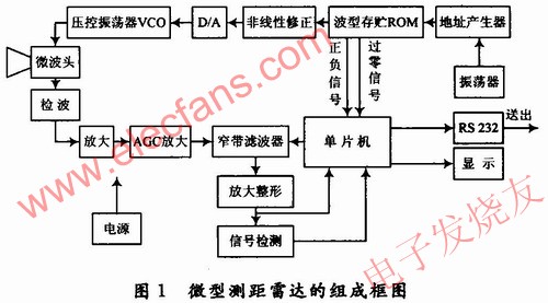 根據三角波調制的雷達原理,首先必須有一個微波頭,微波頭可在測速微波頭的基礎上,將體效應振蕩器加一個變容管改為壓控式振蕩,直接混頻。同時還需要一個三角波發生器。為了修正壓控振蕩器的非線性,使之頻率線性變化,必須進行非線性修正。