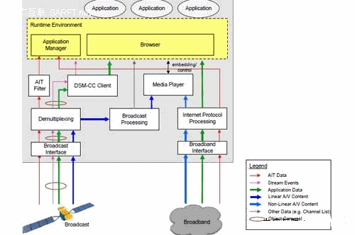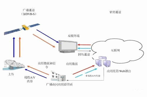 對運(yùn)營商而言,數(shù)字電視數(shù)據(jù)業(yè)務(wù)可能來源于廣播信道(衛(wèi)星、有線或無線等)和/或?qū)拵诺溃ɑヂ?lián)網(wǎng)、或其它的IP通道)的信號,音視頻與數(shù)據(jù)可以不加區(qū)分地由這兩個通道分別接入,在帶寬限制的情況下,廣播通道可以用來播送高清節(jié)目,而寬帶的使用形式就會有很廣,如視頻點(diǎn)播、時移、信息瀏覽、電子商務(wù)等。