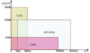 假定黑盒內(nèi)部的電路和信號(hào)輸入均正常,如果黑盒的輸出仍然有問(wèn)題,這時(shí)就應(yīng)該重點(diǎn)排查電源輸入。常用的電源檢測(cè)儀器有示波器、頻譜儀和數(shù)字萬(wàn)用表,它們能夠覆蓋的測(cè)量范圍不同(如圖2所示),應(yīng)該綜合運(yùn)用這些儀器來(lái)全面觀察電源信號(hào),避免測(cè)試盲區(qū)。