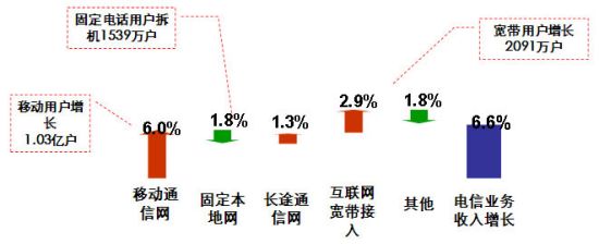 根據1~11月用戶發展及各類業務的收入變化情況,對業務收入增長因素進行量化分析。結果顯示,1~11月行業增幅達6.6%,最主要的增長拉動因素是移動用戶的增長帶來的收入貢獻;第二位的增長拉動因素是互聯網寬帶用戶的發展;而固網業務的進一步萎縮拉低了行業發展速度(見圖2)。