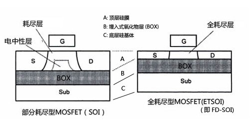 體硅CMOS技術(shù)走到22nm之后,特征尺寸已很難繼續(xù)微縮,急需革新技術(shù)來(lái)維持進(jìn)一步發(fā)展。在候選技術(shù)之中,F(xiàn)DSOI(Fully Depleted SOI,全耗盡SOI)技術(shù)極具競(jìng)爭(zhēng)力。對(duì)于FDSOI晶體管,硅薄膜自然地限定了源漏結(jié)深,同時(shí)也限定了源漏結(jié)耗盡區(qū),從而可改善DIBL(Drain Induced Barrier Lowering,漏致勢(shì)壘降低)等短溝道效應(yīng),改善器件的亞閾特性,降低電路的靜態(tài)功耗。此外,F(xiàn)DSOI晶體管無(wú)需溝道摻雜,可以避免RDF(Random Dopants FluctuatiON,隨機(jī)摻雜漲落)等效應(yīng),從而保持穩(wěn)定的閾值電壓,同時(shí)還可以避免因摻雜而引起的遷移率退化。