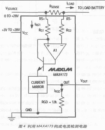 MAXIM推出了一系列雙向或單向電流檢測IC,有些雙向電流檢測IC內置檢流電阻,可檢測流入或流出被檢電路的電流大小并通過一個極性指示引腳顯示電流方向。增益可調的電流檢測IC、固定增益(+20V/V,+50V/V,或+100V/V)電流檢測芯片或包括單雙比較器的固定增益電流檢測IC,都采用小體積封裝,如SOT23,可滿足對尺寸要求苛刻的應用。圖4是用MAX4173構成的高端電流檢測電路。[page]