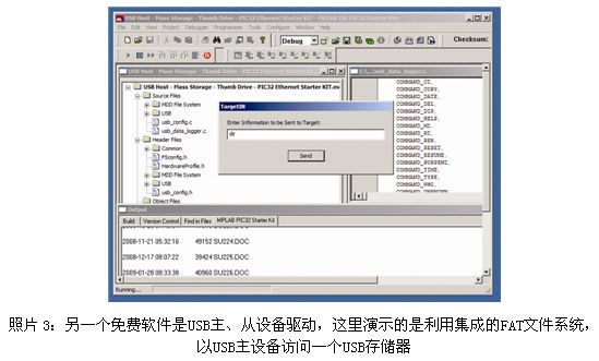 這個套件包含了一些實用的演示。其中一個演示讓該板子成為一個標準人機接口設備(HID)——比如鼠標。因為HID 驅動已經是標準,你可以把它直接插入PC 使用。另外,你可以把這個套件配置成USB 主設備,從而利用PIC32 不斷完善的FAT 文件管理軟件庫,有一些演示展示了如何訪問廣泛使用的USB 存儲器(見照片3)。
