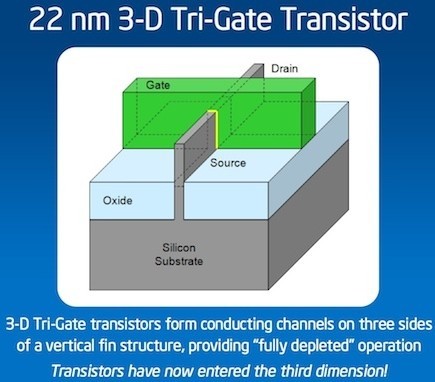 英特爾稱之為3D晶體管,但從技術(shù)上講,這是三門晶體管。傳統(tǒng)的二維門由較薄的三維硅鰭所取代,硅鰭由硅基垂直伸出。