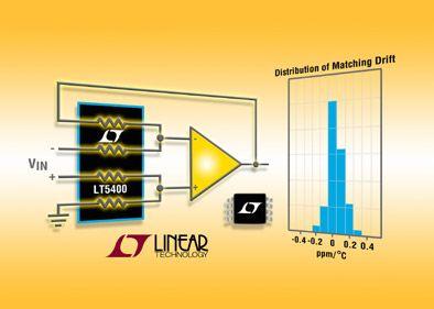 凌力爾特公司(Linear Technology Corporation)推出公司第一個精確匹配的電阻器網絡器件系列LT5400,該系列器件為差分放大器、精準分壓器、基準和橋式電路中的高性能信號調理應用而設計。三款可選版本已全面投產,分別是電阻比率為1:1和10:1的四個10K電阻、四個100K電阻和兩個10K/兩個100K電阻。每款LT5400系列器件在-40℃至85℃的溫度范圍內提供了0.01%的保證匹配準確度,而在-40℃至125℃則提供 0.0125%。LT5400的匹配性能利用“CMRR 匹配”得以增強,這是在采用差分放大器電路配置時用于保證CMRR性能的一種新度量標準。LT5400的CMRR匹配誤差僅為0.005%,比采用獨立電阻器時的0.01%匹配誤差改進了2倍。