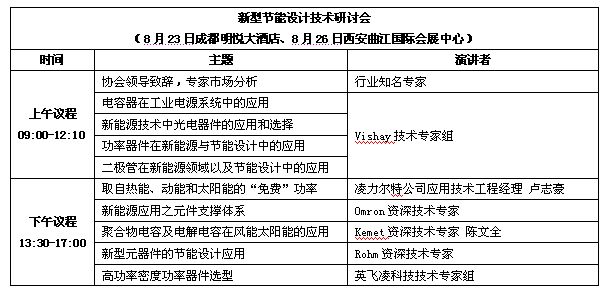 [page]新型節能設計技術研討會以風能太陽能發電與節能設計為主題,圍繞智能電源、逆變器設計、智能控制、馬達控制、新型電子元器件與模塊的應用展開探討,來自知名廠商的技術專家將分享逆變器設計、馬達控制、變頻技術、電力電子技術在風能/太陽能、工業電子、通信設備、軍工上的應用解決方案和節能設計技術。