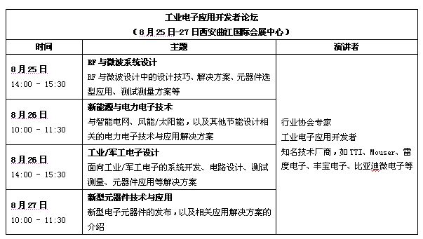 作為2011西部電子論壇中的一個新環節,論壇組委會將聯合2011中國(西安)電子展,同期展會2號館推出工業電子應用開發者論壇,該活動是2011中國(西安)電子展中的核心活動之一,聚焦以西安為中心的電子行業最為關注的RF微波、新能源以及工業應用等主題,邀請研發一線的工程師與領先的技術廠商代表同臺展示設計新技術、新思路、新方案,為工業電子應用開發者提供深入、平等交流的機會。