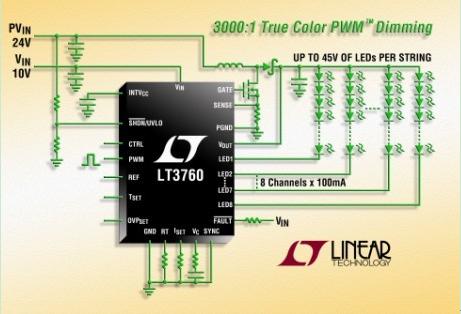 凌力爾特公司 (Linear Technology Corporation) 推出8通道LED驅動器LT3760,該器件采用一個升壓型DC/DC控制器,每個通道能驅動高達45V的100mA LED 串。其內部60V、1MHz DC/DC升壓型控制器設計成面向多達80個白光LED的恒定電流LED驅動器。LT3760用一個12V輸入可以驅動8個通道,每通道多達10個串聯的100mA 白光LED,同時提供超過92% 的效率。其多通道能力使該器件非常適用于中型和大型TFT-LCD背光照明應用。其6V至40V 的輸入電壓范圍使該器件非常適用于汽車、航空電子設備、HDTV 和工業顯示器應用。